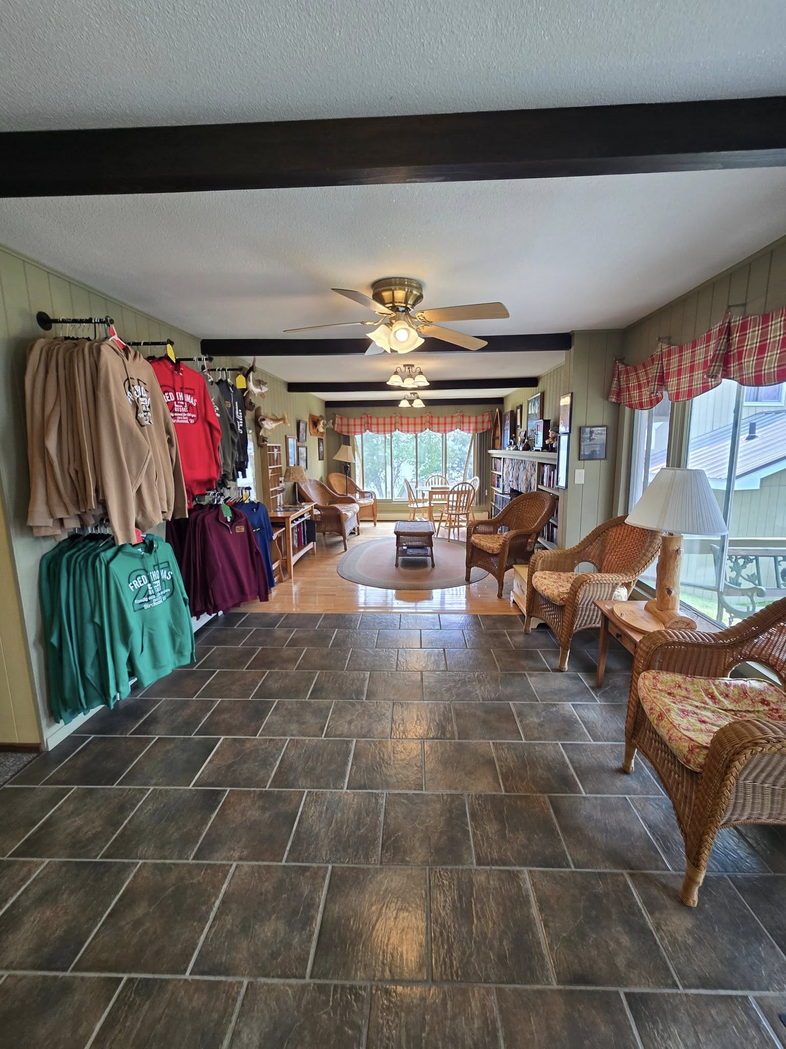 A hallway at Fred Thomas Resort with tile flooring, wicker chairs, a ceiling fan, and a display of colorful sweatshirts and T-shirts on the left wall leads to a windowed seating area—reflecting over 100 years of welcoming guests. – Rice Lake Chamber of Commerce